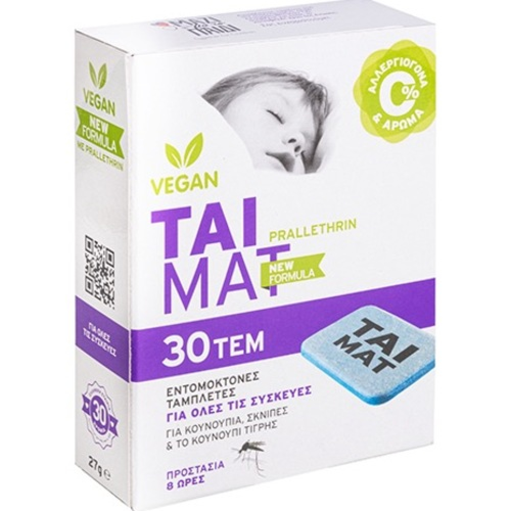ΤΑΙ NEW MAT (30τεμαχίων ) εντομοκτόνες ταμπλέτες που περιέχουν τη δραστική ύλη PRALLETHRIN , μία σύγχρονη δραστική ουσία για την αποτελεσματική καταπολέμηση κουνουπιών & σκνιπών. Στην σύνθεσή τους δεν περιέχουν ΑΛΛΕΡΓΙΟΓΟΝΕΣ ουσίες (0%) και ΑΡΩΜΑ (0%) .Το κουτί περιλαμβάνει 30 ταμπλέτες. Καταπολεμούν κουνούπια & σκνίπες . Μία ταμπλέτα καλύπτει ένα δωμάτιο μέχρι 40 κυβικά, και διαρκεί 8 ώρες (αριθμός έγκρισης κυκλοφορίας : ΥΠ.Α.Α.Τ ΤΠ18-0543 )