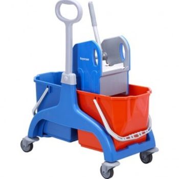 -Το καρότσι διαθέτει μπλέ και κόκκινο κουβά χωρητικότητας 25 λίτρων. Οι δύο κουβάδες επιτρέπουν το διαχωρισμό καθαρού νερού με απορρυπαντικό και του βρώμικου νερού του ξεβγάλματος. Έτσι έχουμε τα βέλτιστα αποτελέσματα σφουγγαρίσματος, υγιεινής, εξοικονόμησης νερού και απορρυπαντικού και χρόνου εργασίας, καθώς απαιτούνται λιγότερες αλλαγές νερού.