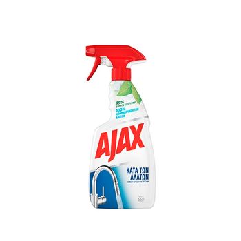 Το Ajax Κατά των Αλάτων Καθαριστικό Spray έχει δημιουργηθεί με 100% καθαριστική δύναμη κατά των αλάτων για την αντιμετώπιση τών σκληρών αλάτων, τα σημάδια νερού και τα υπολείμματα σαπουνιού για γυαλιστερές επιφάνειες. Αυτό το καθαριστικό κατά των αλάτων περιέχει συστατικά 99% φυσικής προέλευσης, έχει 99% βιοδιασπώμενη φόρμουλα και έρχεται σε ανακυκλώσιμο πλαστικό μπουκάλι.