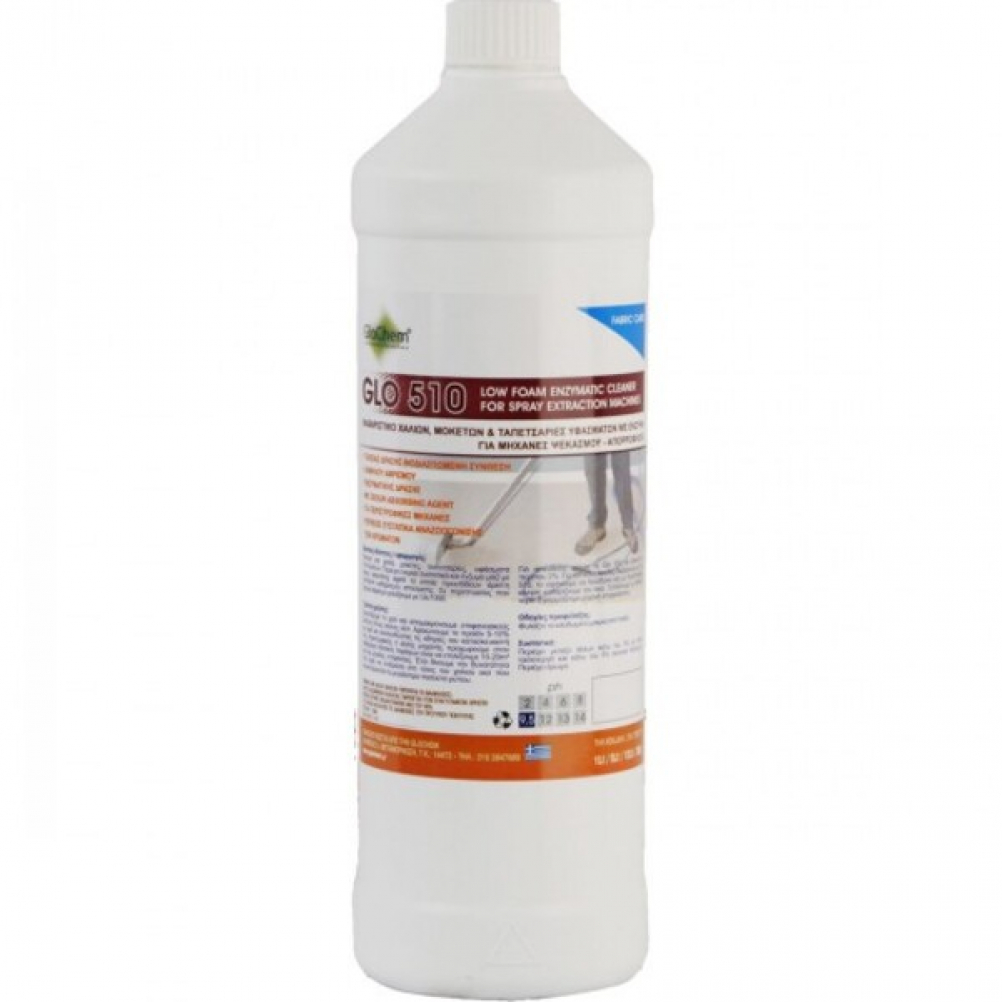 Το Glo 510 είναι ιδανικό για για τον καθαρισμό σε χαλιά, μοκέτες, ταπετσαρίες και υφάσματα επιπλώσεων. Περιέχει ενεργά συστατικά και ένζυμα μαζί με odour absorbing agent τα οποία προσδίδουν άριστη απόδοση καθαρισμού.