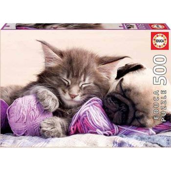 Πάζλ των 500 κομματιών. Μία ζεστή εικόνα με μία γατούλα και ένα σκυλάκι την ώρα που κοιμούνται συντροφιά.