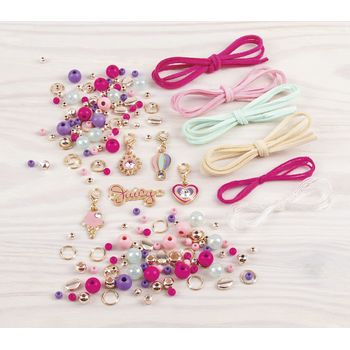 Το σετ περιλαμβάνει ελαστικό κορδόνι, δαντέλα faux σουέτ σε 4 χρώματα, βαμβακερό νήμα σε 5 χρώματα, 223 χάντρες, 20 κρικάκια, 6 μοτίφ διακοσμημένα με Swarovski και οδηγίες χρήσης.