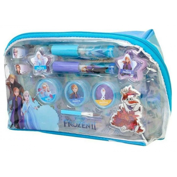 Περιλάμβανει: 1 τσάντα-κασετίνα με φερμουάρ, 3 πούδρες με glitter, 2 lip gloss, 2 κρεμώδεις σκές με glitter, 2 δαχτυλίδια, 1 κραγιόν και 1 μπρελόκ με τον Olaf.
