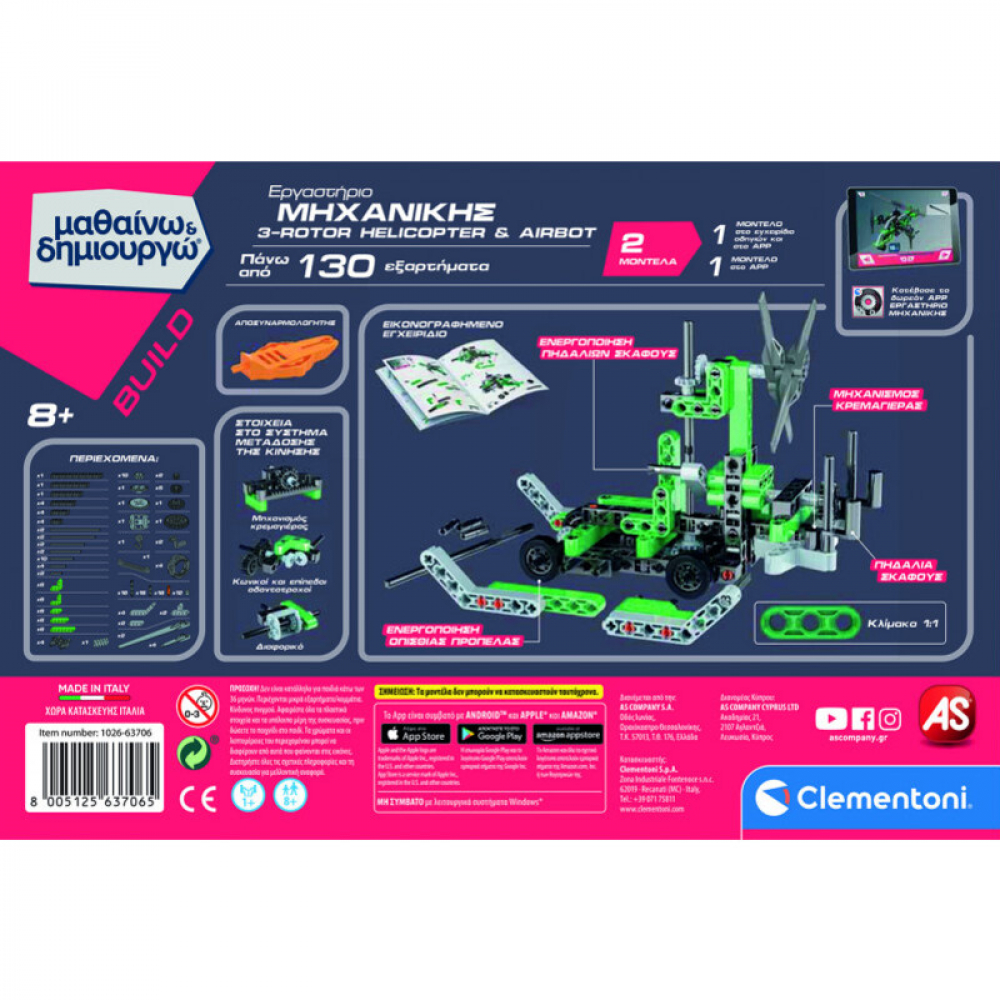 Περιέχει περισσότερα από 130 εξαρτήματα, όπως: κιβώτιο ταχυτήτων, γρανάζια, ράβδους, έλικες, πείρους κ.ά.