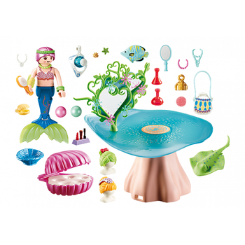 Η γοργόνα στολίζεται μπροστά στον καθρέφτη-κοχύλι στο Σαλόνι Ομορφιάς. Περιλαμβάνει μαργαριτάρια, πολλά αξεσουάρ και μενταγιόν για να δημιουργήσετε ένα πραγματικό κολιέ! Μπορεί να συνδυαστεί με τον κωδ. 70094 - Κοραλλιογενής Ύφαλος με Γοργόνες και Φωτιζόμενο Θόλο.