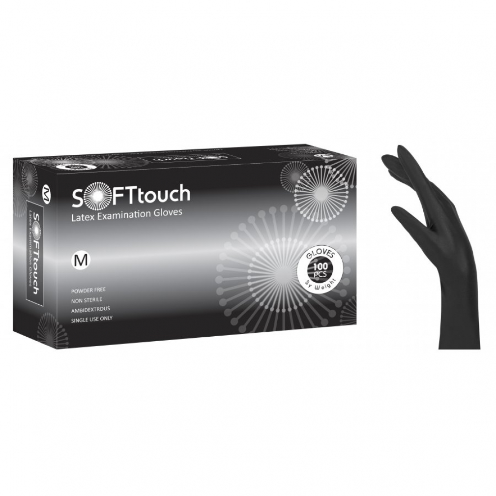 Εξεταστικά γάντια Soft Touch, μίας χρήσης, χωρίς πούδρα, αμφιδέξια, από φυσικό latex, σε μαύρο χρώμα, μη αποστειρωμένα. Είναι ευπροσάρμοστα και δοκιμασμένα με βάση τις υψηλότερες διεθνείς προδιαγραφές.