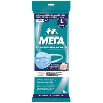 Μάσκες Προστασίας μιας Χρήσης Χειρουργικές Τύπου Ι ΕΝ14683 Large ΜΕΓΑ (Συσ./5τεμ)