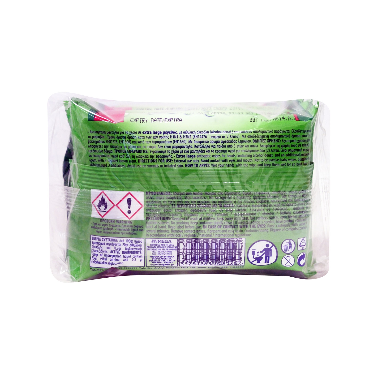 Υγρά αντιβακτηριδιακά μαντήλια με οινόπνευμα και επιπλέον αντιβακτηριδιακούς παράγοντες. Με άρωμα πορτοκάλι.
