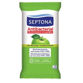 Τα αντιβακτηριδιακά μαντήλια χεριών SEPTONA με άρωμα πράσινο μήλο, εξουδετερώνουν τα μικρόβια και τους ιούς της γρίπης Η1Ν1 και Η3Ν2, χάρη στη σύνθεσή τους με αιθυλική αλκοόλη.