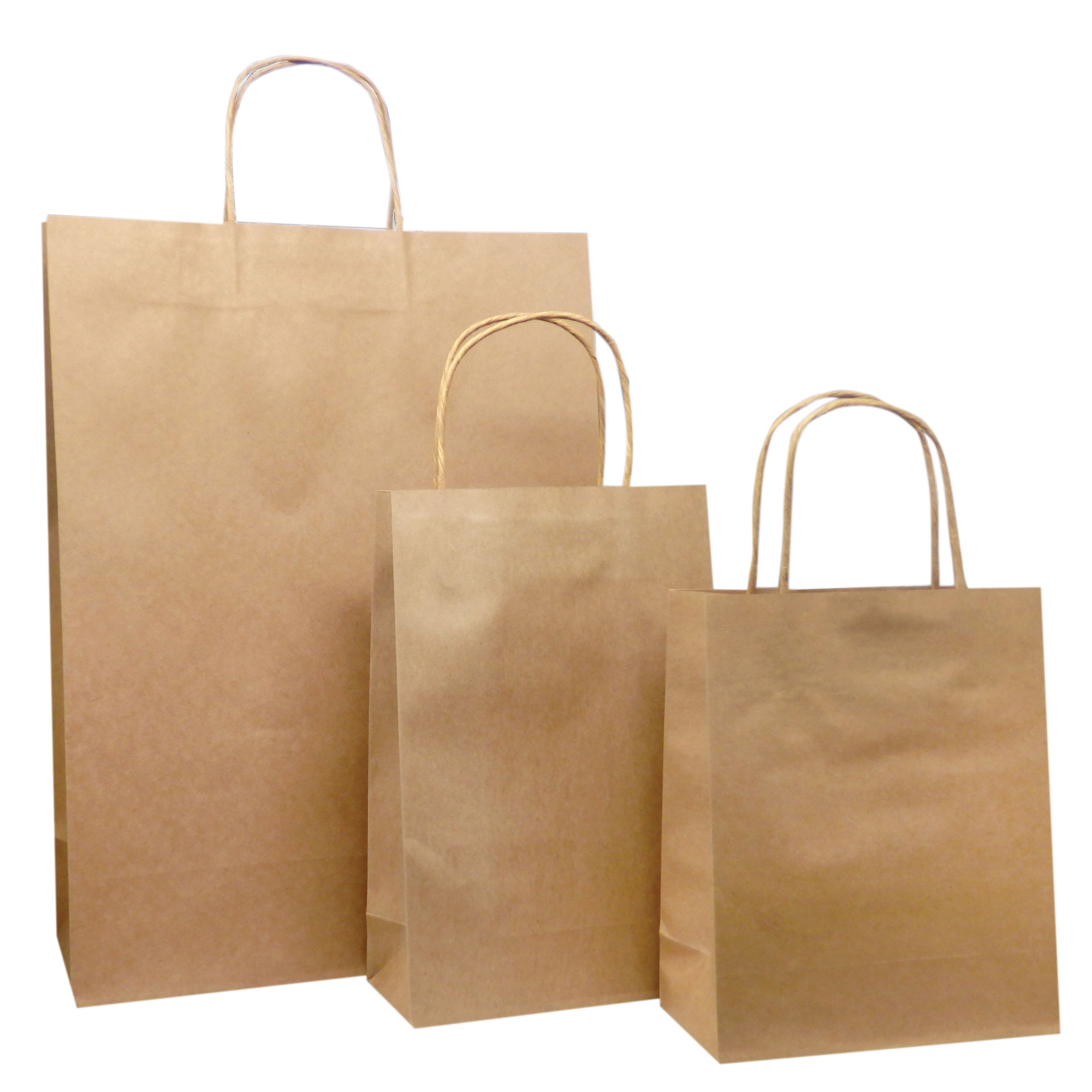 Οι χάρτινες τσάντες είναι κατασκευασμένες από χαρτί κραφτ καφέ 80gsm. Οι δύο λαβές τους είναι κατασκευασμένες από καφέ στριφτό χαρτί. Διατίθεται σε μέγεθος 18x26x08cm.