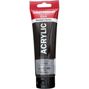 Τιμή λίτρου: 25.833 €Blank page Ακρυλικό χρώμα Vandyke Brown 403 της σειράς Amsterdam All Acrylics Standard Series σε συσκευασία των 120ml. Τα χρώματα Amsterdam Standard Series είναι εξαιρετικής ποιότητας ακρυλικά χρώματα με την εγγύηση της Ολλανδικής Royal Talens. Φτιαγμένα με υψηλής ποιότητας, ανθεκτικές στο φως χρωστικές, εχουν βαθμολογία αντοχής στο φως +++ (100+ χρόνια υπό συνθήκες μουσείου). Η σειρά Standard σας προσφέρει μία ευρεία γκάμα από εξαιρετικά ζωντανά αδιαφανή ακρυλικά χρώματα, εύκολα στη χρήση, τα οποία προσφέρουν ομαλή εφαρμογή. Χρησιμοποιήστε το χρώμα απευθείας από το σωλήνα ή αραιωμένο με λίγο νερό ή ένα από τα διαλυτικά για ακρυλικά χρώματα. Είναι κατασκευασμένα με 100% συνδετικό ακρυλικής ρητίνης, με αποτέλεσμα μια εξαιρετικά ανθεκτική και εύκαμπτη μεμβράνη βαφής με ομοιόμορφο βαθμό γυαλάδας. Άοσμη φόρμουλα με βάση το νερό η οποία γίνεται αδιάβροχη και με μέγάλη αντοχή όταν στεγνώσει. Προσκολλάται σχεδόν σε οποιαδήποτε ελαφρώς πορώδη επιφάνεια, συμπεριλαμβανομένου καμβά, χαρτιού, χαρτονιού, ξύλου, πέτρας και τσιμέντου.