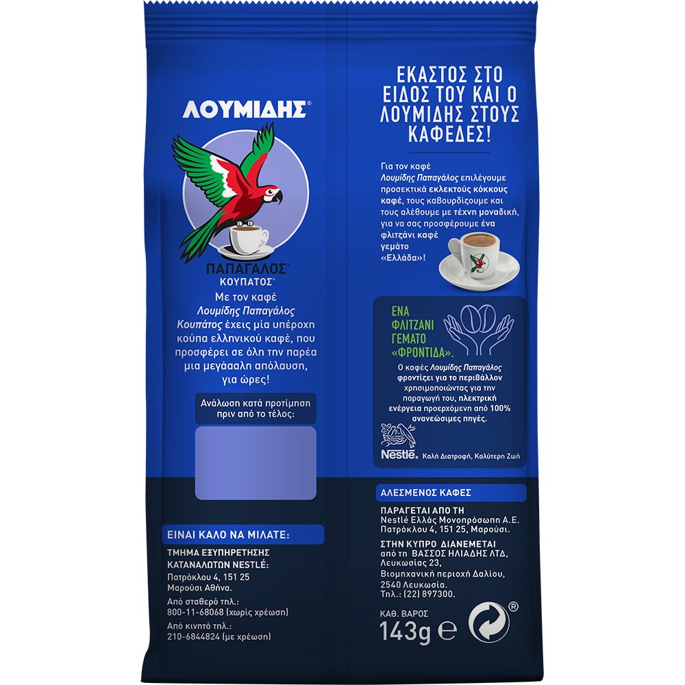 Ο καφές που απολαμβάνεις για ώρες με την παρέα σου είναι ο Λουμίδης Παπαγάλος Κουπάτος. Γιατί με δύο γεμάτες κουταλιές καφέ έχεις 1 υπέροχη κούπα ελληνικού που προσφέρει σε όλη την παρέα μεγάααλη απόλαυση!