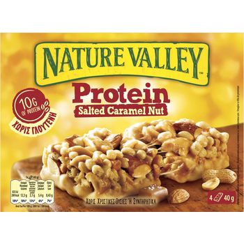 Οι μπάρες πρωτεΐνης Nature Valley με Αλατισμένη Καραμέλα καλύπτουν το 20% της ημερήσιας ανάγκης σας σε πρωτεΐνες. Δεν περιέχουν γλουτένη και φτιάχνονται από προσεκτικά επιλεγμένα συστατικά, όπως αράπικα φιστίκια, αμύγδαλα και αλατισμένη καραμέλα, κάνοντάς το ιδανική επιλογή για να σας δώσει ενέργεια για την επόμενή σας περιπέτεια.