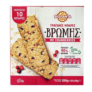 Συστατικά: Νιφάδες βρώμης 26%, cranberries 20%, αλεύρι βρώμης 14%, αλεύρι σίτου ολικής άλεσης, τραγανά δημητριακά (ρυζάλευρο), φυτικό έλαιο (ελαιοφίνικα), ζάχαρη καστανή, μέλι, καρύδα τριμμένη, εδώδιμες φυτικές ίνες, διογκωτικά αρτοποιίας (δισόξινο πυροφωσφορικό νάτριο, διττανρακική σόδα), αλάτι,αρωματική ύλη.