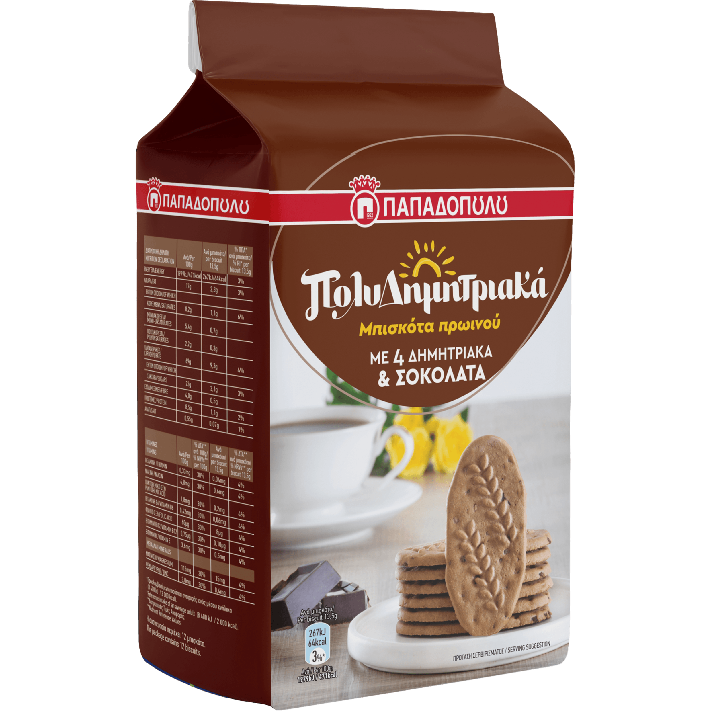Τέσσερα δημητριακά: σιτάρι ολικής άλεσης, σίκαλη, βρώμη και κριθάρι, ενώθηκαν με πλούσια φρούτα, απολαυστική σοκολάτα και μυρωδάτο κακάο, θρεπτικό γάλα και απαραίτητο ασβέστιο, για να δημιουργήσουν ένα μπισκότο που κλείνει μέσα του όλη τη θρεπτική αξία των δημητριακών, φυτικές ίνες, βιταμίνες και ιχνοστοιχεία.
