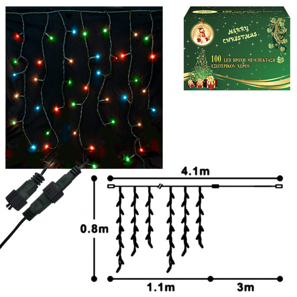 Για εξωτερικό & εσωτερικό χώρο. Δε περιέχεται ο μετασχηματιστής (κωδ. 027834). Μήκος καλωδίου 4,1m Μήκος κουρτίνας 1,1m Ύψος κουρτίνας 0,8m